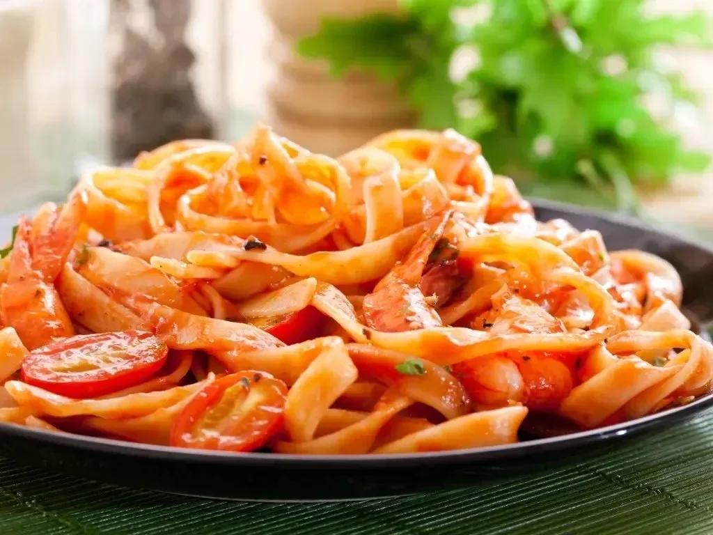 Een pittige pasta met een kruidige tomatensaus, afgewerkt met kip of scampi naar keuze. Ideaal voor wie houdt van een beetje vuur op het bord!